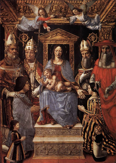 Fig. 3. Maestro della Pala Sforzesca, Pala Sforzesca, Pinacoteca di Brera, Milano, tempera e olio su tavola, c. 1495Questa pala d’altare fu dipinta su commissione di Ludovico il Moro, che era stato nominato duca di Milano nel 1494, per la chiesa di S. Ambrogio in Nemo. Ludovico e sua moglie, Beatrice d’Este, sono rappresentati di profilo, inginocchiati con i loro figli e presentati alla Vergine da S. Ambrogio, che appoggia la mano sulla spalla del duca, e i Dottori della Chiesa S. Agostino, S. Gregorio e S. Girolamo. Beatrice indossa una camora di satin giallo dorato con liste di velluto nero applicate, e con nastri d’oro che allacciano le maniche al corpetto e che decorano le maniche. Perle e pietre preziose le adornano i capelli, che sono legati dietro la testa nel coazzone di moda alla corte sforzesca.