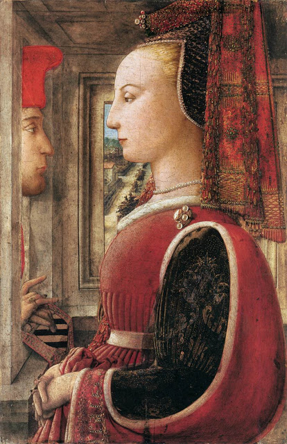 Fig 2. Filippo Lippi, Ritratto di dama (Angiola Sapiti con il marito Lorenzo Scolari), Metropolitan Museum of Art, New York, tempera su tavola, c.1438. Un doppio ritratto, probabilmente commissionato in occasione del matrimonio dei due personaggi la cui identità è indicata dallo stemma della famiglia Scolari sotto le mani dell’uomo. La donna occupa la parte più importante del dipinto, e sfoggia un abito e un’acconciatura confezionati con tessuti ricchissimi e impreziositi da gioielli. I capelli sono nascosti da una sella alla francese o alla fiamminga, con una cuffia ricamata e orlata di perle, con un cappuccio ricamato con filo d’oro, perle e pietre preziose. La cioppa rossa è bordata di pelliccia, e stretta sopra la vita da una cintura d’argento. Le pieghe , trattenute dalla mani, mostrano la quantità del costoso tessuto usata per confezionare questo indumento. L’ampia manica a gozzo termina al polso con un ricamo in oro con la scritta “LEALTÀ”, una virtù appropriata a una sposa, ed è tagliata in modo da far vedere la manica della gamurra. Questa sembra essere di un velluto “alto e basso”, allucciolato e broccato, costosissimo, che pochi tessitori riuscivano a produrre e che richiedeva una lunghissima lavorazione.